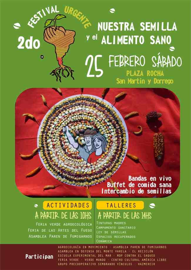 El sábado 25 de Febrero a partir de las 10 hs. en Plaza Rocha (San Martín y Dorrego) se desarrollará el Festival URGENTE por Nuestra Semilla y el Alimento Sano con el objetivo de dar a conocer la importancia de la semilla nativa y el avance de la ley que pretende privatizar la vida.