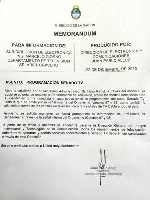 El memo fue suscripto por el director de Electrónica y Comunicaciones de la Cámara de Senadores, Juan Pablo Alluz, cuya nota concluye: «A partir de la fecha y mientras se encuentre vacante la Dirección General de Imagen Institucional y Tecnología de la Comunicación, todos los requerimientos de televisación, coberturas de cámaras y demás servicios concernientes a Senado TV deberán ser canalizados a través de esa Dirección».
