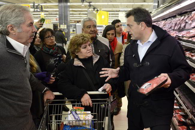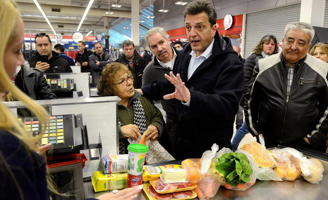 En el marco de la recorrida por un hipermercado de San Justo, acompañado por el diputado Felipe Solá, el legislador provincial Rubén Ledesma y los precandidatos a concejales Fernando Asencio y Laura Piperno, Sergio Massa se pronunció sobre el aumento de precios y afirmó: “Estamos recorriendo los supermercados para que la gente pueda ver la vergüenza que significa que hoy en Argentina a muchos no les alcance para llegar a fin de mes. A los jubilados que cada vez les cuesta más, les cobran impuestos por comer. En los productos de la canasta básica nos encontramos con que hay $5 que no son polenta, son impuestos. Hay $8 pesos que no son yerba, son impuestos. Hay $9 que no son aceite, son impuestos”.