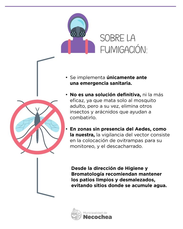 Asimismo, sobre la fumigación recordaron que se implementa únicamente ante una emergencia sanitaria y que “no es una solución definitiva, ni la más eficaz, ya que mata solo al mosquito adulto, pero a su vez, elimina otros insectos y arácnidos que ayudan a combatirlo”.