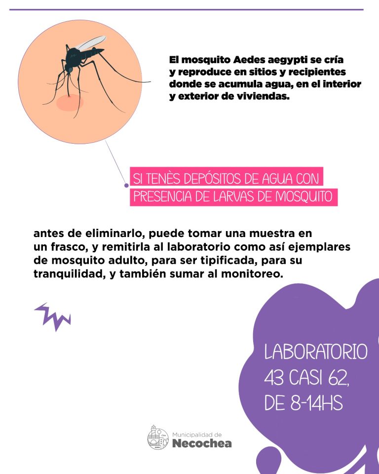 En zonas sin presencia del vector, como la nuestra, la vigilancia consiste en la colocación de ovitrampas para su monitoreo, y el descacharrado; por lo que pidieron a la ciudadanía que, en caso de tener depósitos de agua con presencia de larvas de mosquito, antes de eliminarlas, se tome una muestra en un frasco para remitirla al laboratorio de la Dirección, en Avenida 43 casi 62 y en el horario de 8 a 14, como así también de los ejemplares de mosquitos adultos, para ser tipificada y sumada al monitoreo.