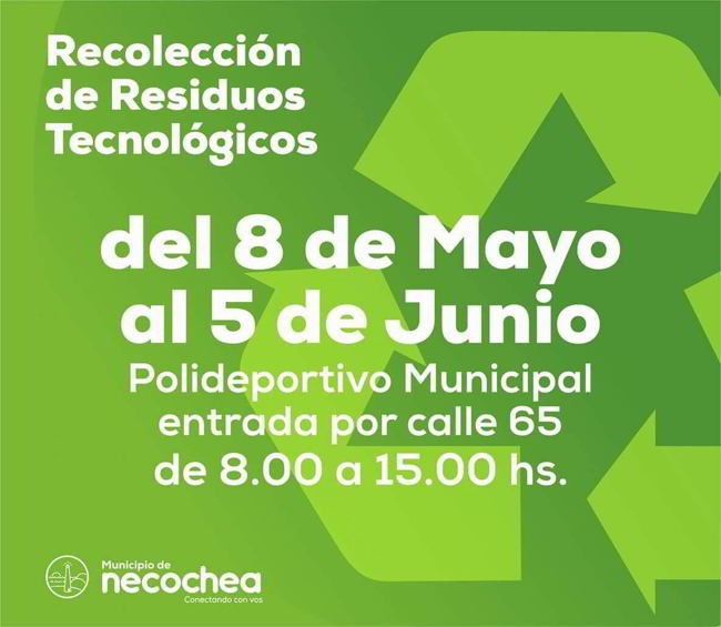 Se realizará en el Polideportivo Municipal, desde el 8 de mayo y hasta el 5 de junio, de lunes a viernes entre las 8 y las 15. Lo colectado en el municipio tendrá tratamiento en la Unidad Nº1 de Lisandro Olmos, La Plata. Se reciben CPU, netbook, televisores, radios, cámaras fotográficas, impresoras, teléfonos, entre otros artefactos