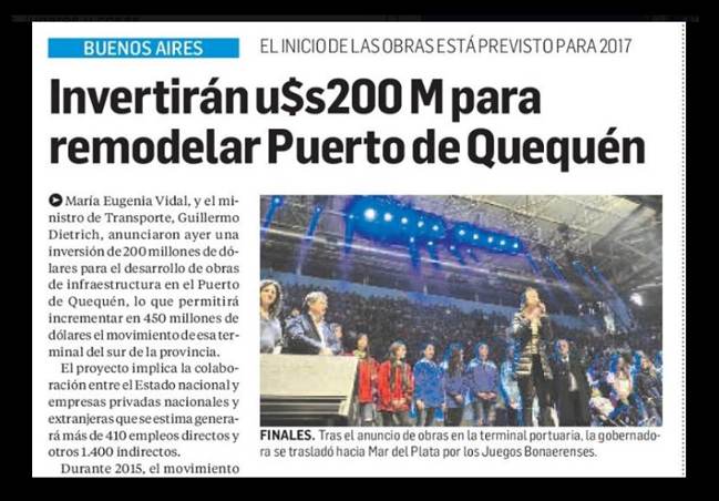 Medios nacionales se hicieron eco de los importantes anuncios realizados por la gobernadora, María Eugenia Vidal, y el ministro de Transporte de la Nación, Guillermo Dietrich, referidos a Puerto Quequén.