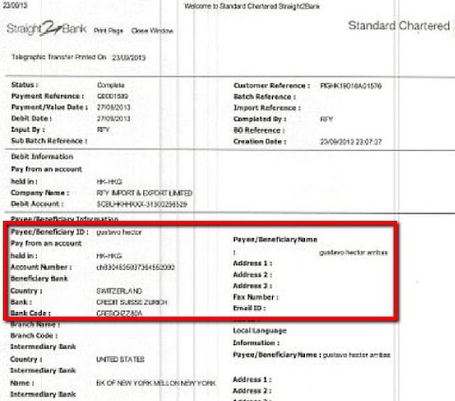 El arrepentido ya había declarado en Brasil haber realizado cinco transferencias desde la cuenta 313-0-025652-9 del Standard Chartered Bank Hong Kong perteneciente a una sociedad controlada por “Meirelles RFY Import & Export Limited”, a una cuenta 373645-5 que Arribas posee en la sucursal Zurich del Credit Suisse. Los pagos se realizaron entre el 25 y el 27 de septiembre de 2013 con montos de US$ 154.666, US$ 70.500, 120.352, 90.000 y 159.000 dólares totalizando 594.518 dólares.
