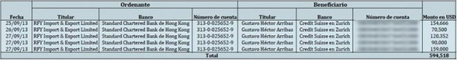 El arrepentido ya había declarado en Brasil haber realizado cinco transferencias desde la cuenta 313-0-025652-9 del Standard Chartered Bank Hong Kong perteneciente a una sociedad controlada por “Meirelles RFY Import & Export Limited”, a una cuenta 373645-5 que Arribas posee en la sucursal Zurich del Credit Suisse. Los pagos se realizaron entre el 25 y el 27 de septiembre de 2013 con montos de US$ 154.666, US$ 70.500, 120.352, 90.000 y 159.000 dólares totalizando 594.518 dólares.