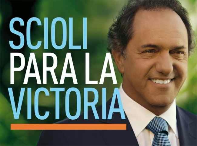 La pieza publicitaria muestra a Scioli sonriente, de traje y corbata en la gama de los azules y con camisa blanca sobre el margen derecho, y a su izquierda la leyenda «Scioli Para la Victoria» en celeste y blanco.
