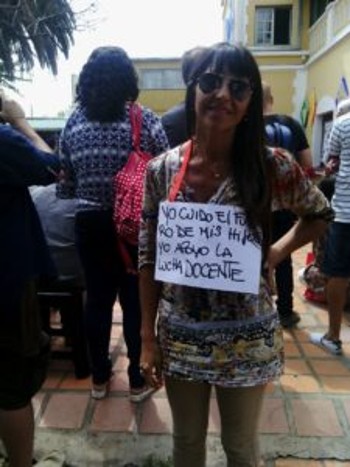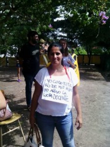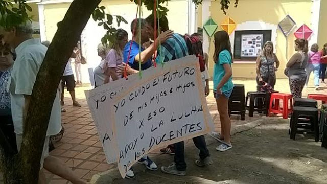 Los padres y madres del establecimiento educativo Crear y Ser de Castelar, donde concurren los hijos de la gobernadora María Eugenia Vidal, esperaron a la jefa bonaerense con carteles de apoyo a la lucha docente. “Yo cuido el futuro de mis hijos, por eso apoyo la lucha docente”.