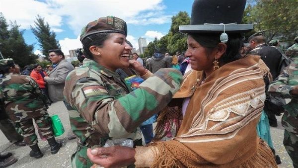 “Fuerzas Armadas, únanse a la lucha” corean los manifestantes, mientras los soldados responden “Que viva Bolivia, que viva la Wiphala”.