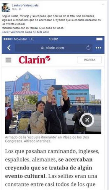 «Según Clarín, mi viejo y su esposa, que son los de la foto, son alemanes, ingleses o españoles que se acercaron creyendo que la escuela itinerante es un evento cultural. Mienten hasta con mi familia. Que cosa de locos», escribió en su muro de Facebook Lautaro Valenzuela un bonaerense al igual que su padre, que aparece en la portada del diario Clarín.