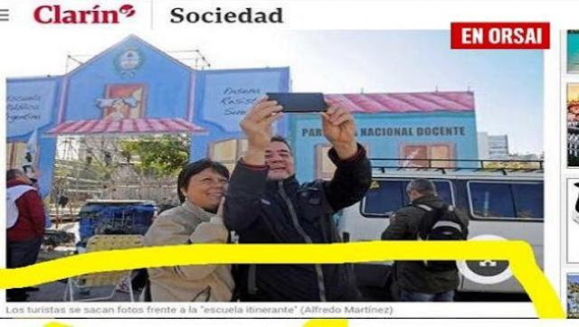 La nota que intentaba desprestigiar la instalación de la #EscuelaItinerante y la lucha docente fue desarmada rápidamente. El joven realizó una captura de pantalla del multimedio donde señalaba a la pareja y decía: “Los que pasaban caminando ingleses, franceses, españoles, alemanes se acercaban creyendo que era un evento cultural. Las selfies eran una constante”.