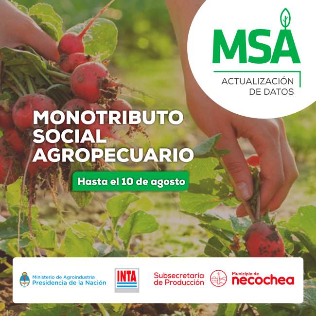 La Subsecretaría de Producción de la Municipalidad de Necochea informa a los agricultores familiares usuarios del Monotributo Social Agropecuario (MSA) que, por resolución del Ministerio de Agroindustria de la Nación, deberán actualizar sus datos en el registro antes del 10 de agosto.