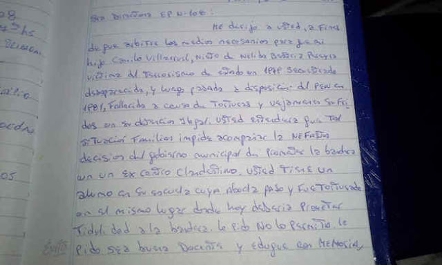 Una madre de la escuela 108 de Morón, cuya madre a su vez fue detenida y desaparecida, le envió esta nota en el cuaderno de comunicados de su hijo a la directora del establecimiento.