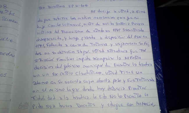 Me dirijo a usted a fines de que arbitre los medios necesarios para que mi hijo Camilo Villaruel, nieto de Nélida Beatriz Pereyra, víctima del terrorismo de Estado en 1979, secuestrada, desaparecida y luego pasada a disposición del PEN en 1981, Fallecida a causa de torturas y vejámenes sufridos en su detención ilegal. Usted entenderá que tal situación familiar impide acompañar la NEFASTA decisión del gobierno municipal de prometer la bandera en un ex centro clandestino.