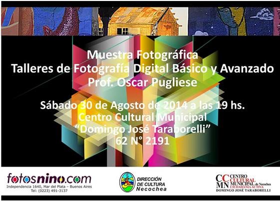 La Dirección de Cultura informa que, en el Centro Cultural Municipal Taraborelli, el profesor Oscar Pugliese realizará una muestra de los alumnos de los Talleres de Fotografía Digital Niveles Básico y Avanzado.