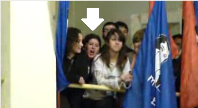 En el minuto 1:13 del video se observa como una mujer emerge desde atrás (se hallaba escondida entre sus compañeros en la barra del primer piso) y lanza gruesos improperios, llegando incluso a insultar al concejal radical Alberto Esnaola, blanco predilecto de las huestes K por estas horas.