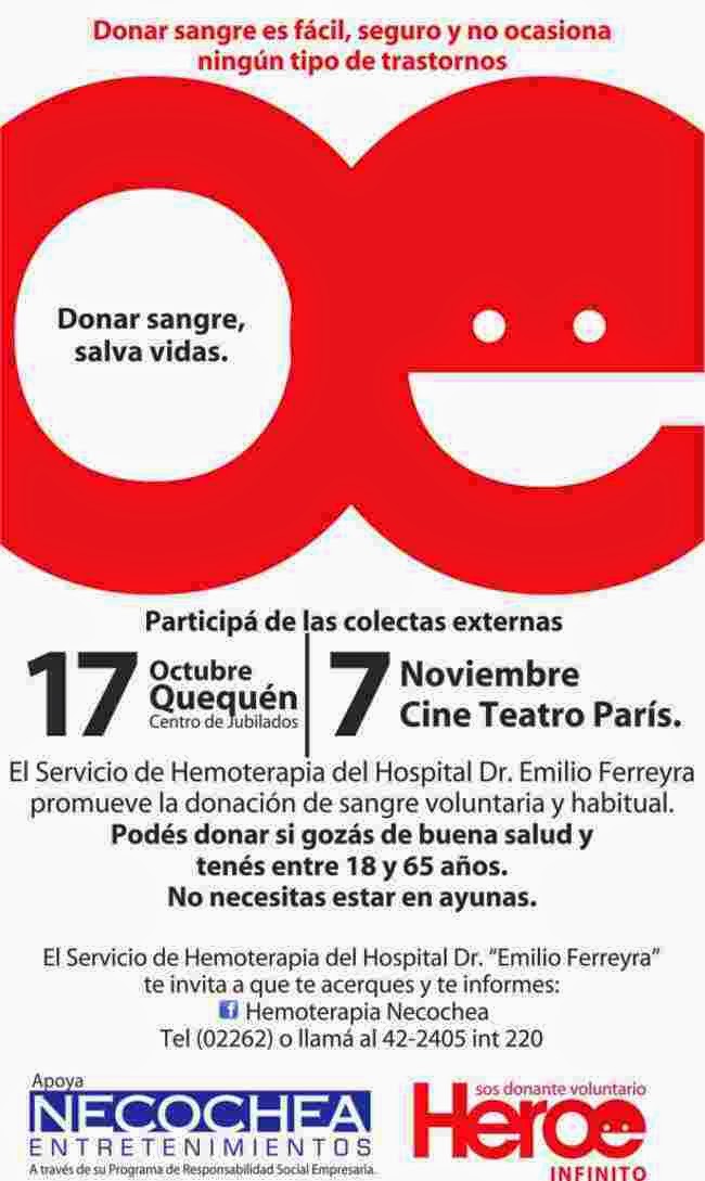 El Servicio de Hemoterapia del Hospital Dr. “Emilio Ferreyra” convoca a toda la comunidad a participar de la colecta de donación voluntaria de sangre que realizará este viernes 17 en el Centro de Jubilados de Quequén ubicado en calle 519 Nº 2746 desde las 8:00hs y hasta las 12:00hs.