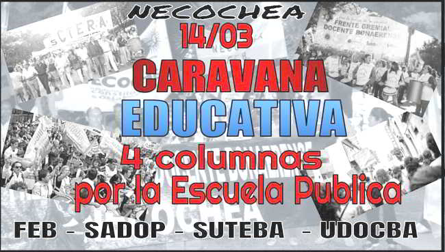 En un comunicado a la prensa, el Frente de Unidad Docente a nivel local organiza para el MARTES 14/03 Caravanas Docentes partiendo a las 9hs desde los siguientes puntos: