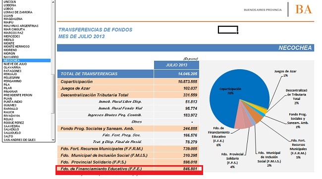A partir del 1 de enero de este año, la Municipalidad de Necochea cuenta con una herramienta financiera novedosa: una suculenta partida que llega del gobierno nacional (vía la provincia) denominada Fondo de Financiamiento Educativo. En el pasado mes de julio el municipio recibió 846.801 pesos (tal como se puede apreciar en la web del ministerio de economía provincial).
