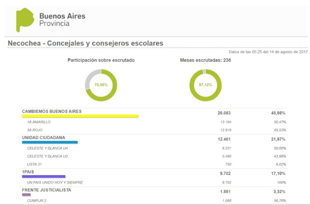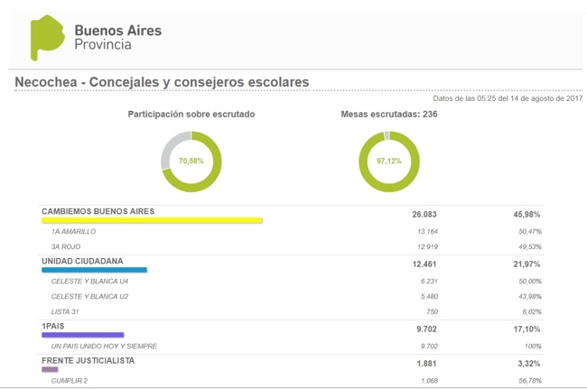 Con el escrutinio provisorio realizado con datos de las 05:25 del 14 de agosto de 2017, las cifras quedaron así dispuestos.