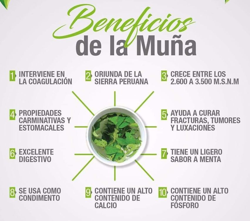 Muña Muña: Su nombre científico es Micromria Eugeniodes. Es una planta muy usada en las provincias de Salta y Tucumán, y muy conocida en las sierras del norte, donde abunda. Da muy buenos resultados en casos de calambres de vientre, dolores de estomago en general, acidez, indigestión, cólicos. Etcéra. Muchos hombres usan esta hierba para solucionar su impotencia, ya sea bebiendo una infusión, dos veces por día, o una dosis diaria de su tintura madre. Además, esta comprobado que el té está indicado para mujeres que tienen menstruaciones escasas o muy atrasadas. Con una toma similar, el periodo se regulariza.
