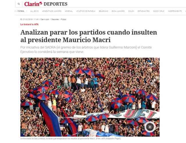 Luego de que los insultos al presidente de la Nación, Mauricio Macri se repitieran en varias canchas del fútbol argentino, Guillermo Marconi, titular del  Sindicato de Arbitros Deportivos de la Republica Argentina confirmo que: «Lo estamos analizando. Estamos viendo la cuestión legal. Si se encuadra dentro de un acto de discriminación» y en caso de que esto vuelva a suceder suspenderán los partidos.