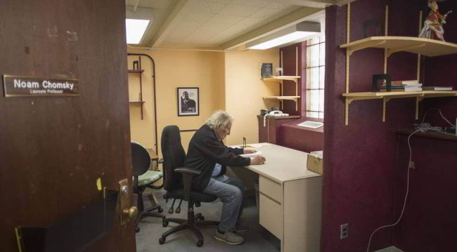 Una luz seca envuelve a Chomsky. Después de 60 años dando lecciones en el Massachusetts Institute of Technology (MIT), el profesor se ha venido a vivir a los confines del desierto de Sonora. En Tucson, a más de 4.200 kilómetros de Boston, ha abierto casa y estrenado despacho en el Departamento de Lingüística de la Universidad de Arizona. El centro es uno de los pocos puntos verdes de la abrasada ciudad. Fresnos, sauces, palmeras y nogales crecen en torno a un edificio de ladrillo rojo de 1904 donde todo queda pequeño, pero todo resulta acogedor. Por las paredes hay fotos de alumnos sonrientes, mapas de las poblaciones indígenas, estudios de fonética, carteles de actos culturales y, al fondo del pasillo, a mano derecha, el despacho del mayor lingüista vivo.