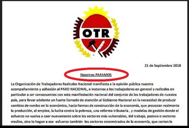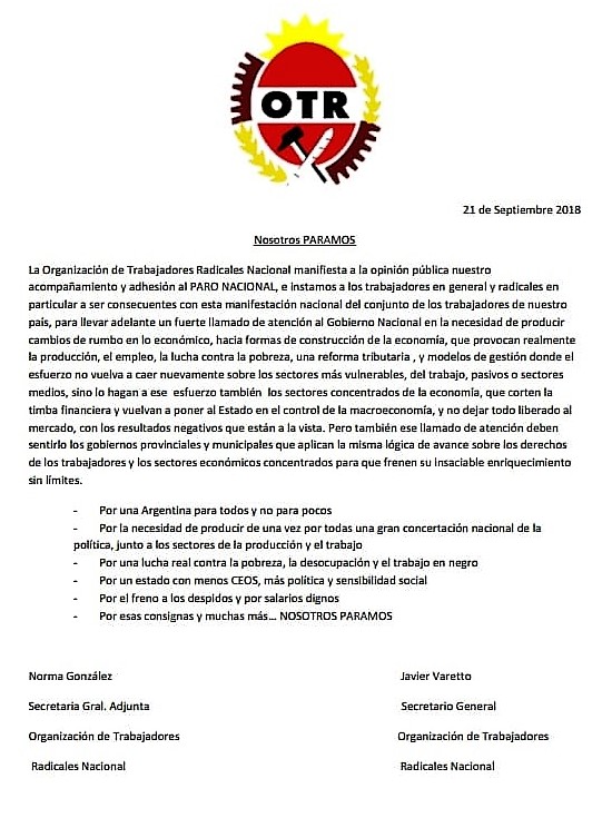 La Organización de Trabajadores Radicales Nacional manifiesta a la opinión pública nuestro acompañamiento y adhesión al PARO NACIONAL, e instamos a los trabajadores en general y radicales en particular a ser consecuentes con esta manifestación nacional del conjunto de los trabajadores de nuestro país, para llevar adelante un fuerte llamado de atención al gobierno nacional en la necesidad de producir cambios de rumbo en lo económico, hacia formas de construcción de la economía, que provocan realmente la producción, el empleo, la lucha contra la pobreza, una reforma tributaria, y modelos de gestión donde el esfuerzo no vuelva a caer nuevamente sobre los sectores más vulnerables, del trabajo, pasivos o sectores medios, sino lo hagan a ese esfuerzo también los sectores concentrados de la economía, que corten la timba financiera y vuelvan a poner al Estado en el control de la macroeconomía, y no dejar todo liberado al mercado, con los resultados negativos que están a la vista. Pero también ese llamado de atención deben sentirlo los gobiernos provinciales y municipales que aplican la misma lógica de avance sobre los derechos de los trabajadores y los sectores económicos concentrados para que frenen su insaciable enriquecimiento sin límites.