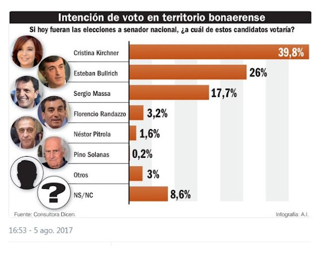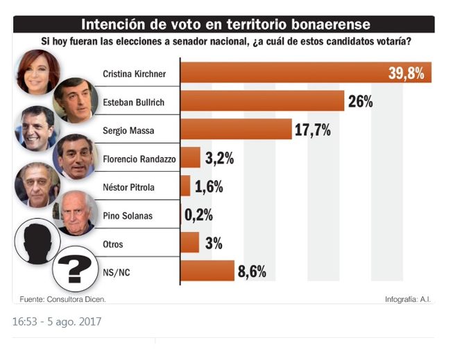 La precandidata a Senadora Cristina Kirchner obtendría el 39,8 por ciento de los votos si las elecciones fueran hoy en la provincia de Buenos Aires, de acuerdo al último relevamiento realizado por la consultora Dicen.