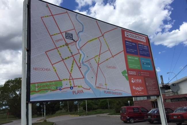 El cartel tiene en ambas caras la misma información acerca del recorrido de las líneas de transporte urbano, a fin de facilitar su uso.