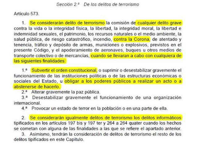 Según el Artículo 573. Se considerarán delito de terrorismo la comisión de cualquier delito grave contra la vida o la integridad física, la libertad, la integridad moral, la libertad e indemnidad sexuales, el patrimonio, los recursos naturales o el medio ambiente, la salud pública, de riesgo catastrófico, incendio, contra la Corona, de atentado y tenencia, tráfico y depósito de armas, municiones o explosivos, previstos en el presente Código, y el apoderamiento de aeronaves, buques u otros medios de transporte colectivo o de mercancías, cuando se llevarán a cabo ….»