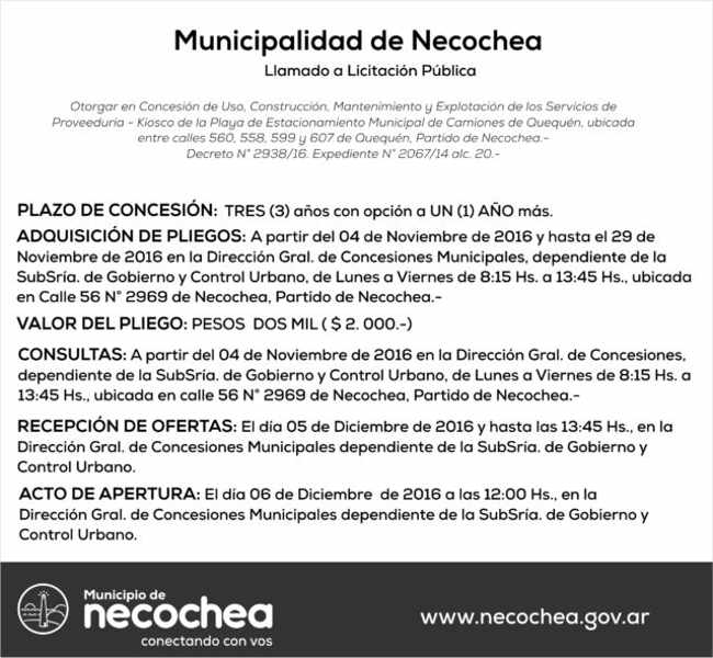 La Dirección General de Concesiones Municipales, dependiente de la Subsecretaría de Gobierno y Control Urbano, lanza dos nuevas licitaciones públicas para otorgar en Concesión de Uso, Construcción, Mantenimiento y Explotación, por un plazo de tres (3) años con opción a uno (1) más, los servicios de Kiosco – Proveeduría y de Restaurant – Salón Comedor en la Playa de Estacionamiento Municipal de Camiones de Quequén, ubicada entre calles 560, 558, 599 y 607.
