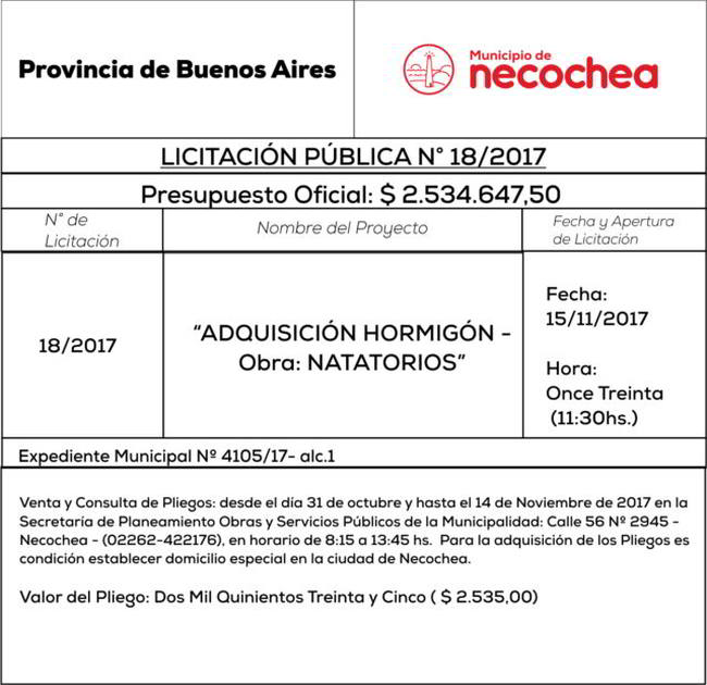 La Secretaría de Planeamiento, Obras y Servicios Públicos de la Municipalidad de Necochea lanzó la licitación número 18/17 para la adquisición del hormigón que se destinará a la obra de Natatorios, con un presupuesto oficial de 2.534.647,50 pesos.
