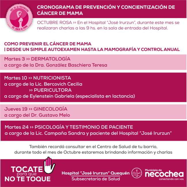 A través de un trabajo interdisciplinario y con el objetivo de promocionar la detección temprana de tumores mamarios, la Subsecretaría de Salud, a través del Hospital Municipal “José Irurzun”, organizó un cronograma de charlas para llevar concientización a la comunidad en el marco de la Campaña de Prevención del Cáncer de Mama.