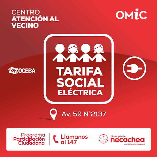 El Centro de Atención al Vecino, espacio dependiente del Programa de Participación Ciudadana de la Municipalidad de Necochea, informa que el Organismo de Control de Energía Eléctrica de la Provincia de Buenos Aires tiene abierto el registro para aquellos ciudadanos que pretendan ser favorecidos con la Tarifa Social Eléctrica.
