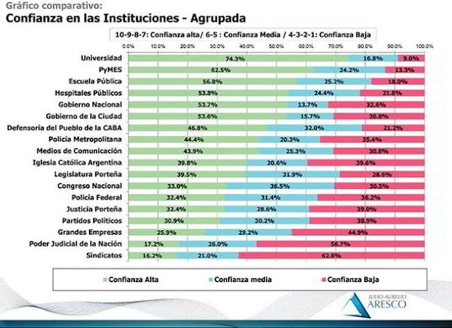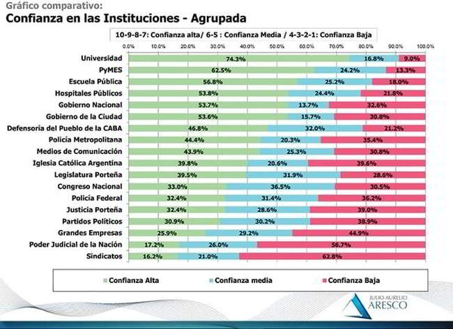 El sentido común es un lenguaje que preside, entre otras cosas, de la plena información. Un relavemiento de la encuestadora Taquion y Trespuntozero, realizado en febrero de este año, relevó que el 75,7% de los encuestados reconocen tener poca o nada confianza en lo que dicen los medios de comunicación. De la misma forma, el elector desconfía más de las instituciones tradicionales de la democracia: el Congreso, el Poder Judicial, los partidos políticos y los sindicatos. En la Ciudad de Buenos Aires, la consultora Aresco realizó, en 2016, un relevamiento de las instituciones que despertaban en los porteños más y menos confianza.