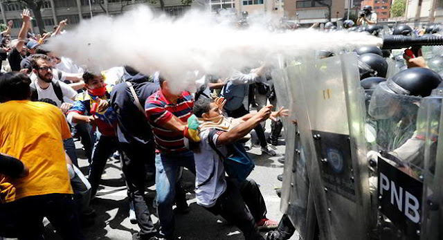 A pesar de que los grupos de choque opositores recurrentemente hacen uso de la violencia contra la población pobre, la prensa internacional los describe como pacíficos, libertarios, “ cool” y hasta sexis”. Y, aunque los comandos que ejecutan la violencia callejera están integrados por paramilitares colombianos, lúmpenes pagados, bandas de delincuentes y grupos de choque con entrenamiento en guerra irregular, se les presenta como jóvenes idealistas que luchan contra la dictadura castrocomunista durante el día y luego van a reventarse de noche; que combinan las máscaras antigases en las barricadas con los vestidos de moda y los tragos exóticos cuando el sol se oculta (véase, por ejemplo, https://goo.gl/djHLgQ y https://goo.gl/LY8w3z).