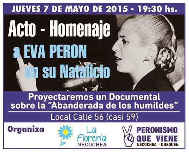 A las 17 hs. tendrá lugar un homenaje en el busto de Eva Perón ubicado en la plaza Hipólito Irigoyen, frente a la delegación de Quequén, organizado por el Movimiento Evita-JP Evita, el espacio de Confianza Necochea y otras agrupaciones del kirchnerismo local.