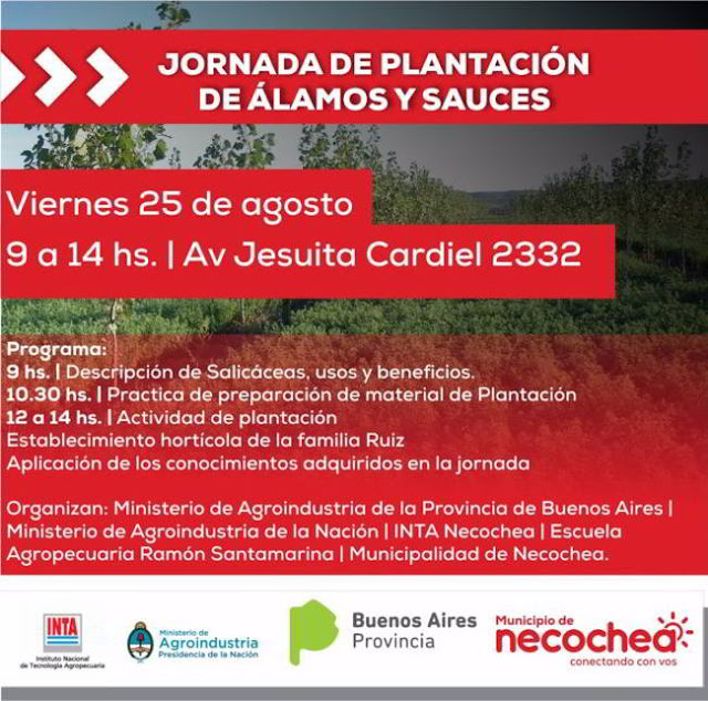 Este viernes 25 de agosto y en un trabajo interinstitucional, que mancomuna el esfuerzo de la Municipalidad de Necochea, los ministerios de Agroindustria nacional y provincial, el INTA Necochea y la Escuela Agropecuaria de Ramón Santamarina, se realizará una Jornada de Plantación de Álamos y Sauces en Avenida Jesuita Cardiel al 2332, abierta a la comunidad pero con vacantes limitadas.