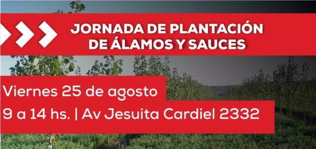 Este viernes 25 de agosto y en un trabajo interinstitucional, que mancomuna el esfuerzo de la Municipalidad de Necochea, los ministerios de Agroindustria nacional y provincial, el INTA Necochea y la Escuela Agropecuaria de Ramón Santamarina, se realizará una Jornada de Plantación de Álamos y Sauces en Avenida Jesuita Cardiel al 2332, abierta a la comunidad pero con vacantes limitadas.