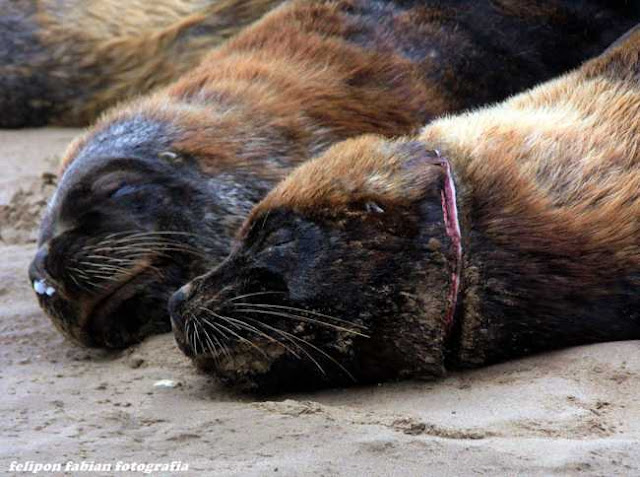“Pero eso no sería nada; lo inmoral de todo esto es que para mostrar que están haciendo algo, con la pala mecánica lesionaron dos lobos marinos, uno de ellos con un fuerte golpe en el cráneo, y al otro le reventaron el ojo y su maxilar», señaló.
