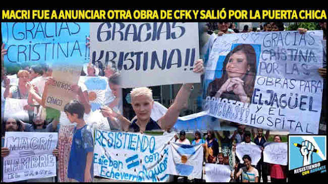 En el lugar, el actual presidente fue esperado por vecinos con los consabidos carteles: MACRI = HAMBRE, sumado a banderas y cartulinas caseras recordándole que el Hospital es una obra del gobierno Kirchnerista y agradeciéndole a Cristina por ella. Macri, a fin de evitar el encuentro, abandonó el lugar por una puerta trasera.