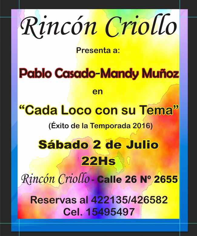 Este sábado 2 de Julio de 2016 a las 22 hs. se presenta el espectáculo de Pablo Casado y Mandy Muñoz de humor y música «Cada Loco con su Tema», la cita es en Rincón Criollo Calle 26 Nº 2655, podes reservar entradas a los Tel 422135 / 426582 – Cel 15495497.