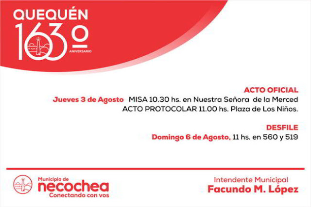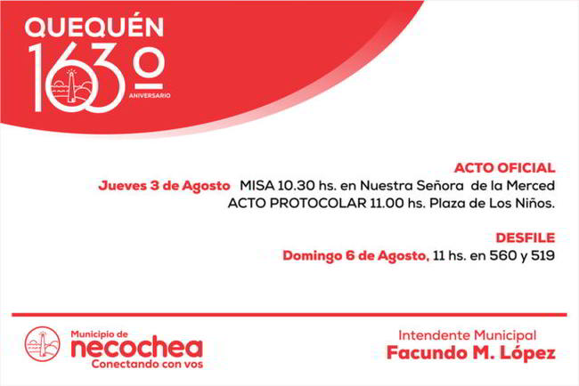 Mañana jueves, Quequén estará cumpliendo su 163º aniversario, y desde las 10.30 se realizará la tradicional misa en la Iglesia Nuestra Señora de la Merced, seguida del acto protocolar, frente a la Plaza de los Niños.