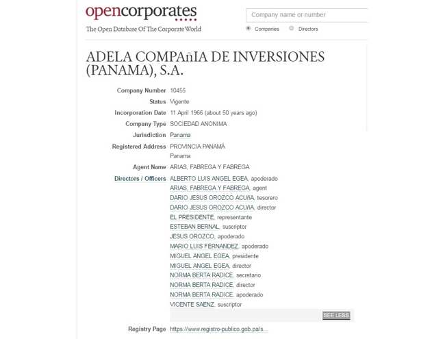 Una de las sociedades, Adela Compañía de Inversiones SA, posee un capital declarado de 10 millones de dólares. El “presidente” de la compañía, de acuerdo a ese registro, es Miguel Angel Egea, que a la vez aparece como su “representante”. En el directorio están Norma Beatriz Radice y otros nombres asociados a ellos en otras empresas de Buenos Aires como Darío Jesús Orozco Acuña.