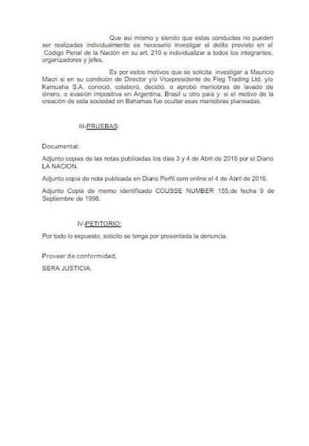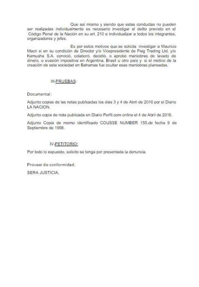 Fue presentada formalmente la primera denuncia contra el Presidente de la Nación Argentina. La presentó el diputado nacional por la provincia de Neuquén, Norman Darío Martinez. La denuncia está presentada por presunta comisión del delito por lavado de dinero y/o evasión fiscal, y tomando como base el artículo del Diario La Nación con fecha 3 y 4 de abril y el diario Perfil de la misma fecha.