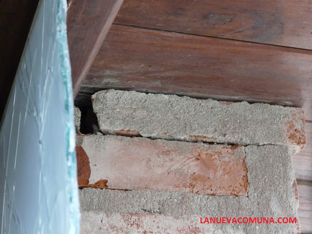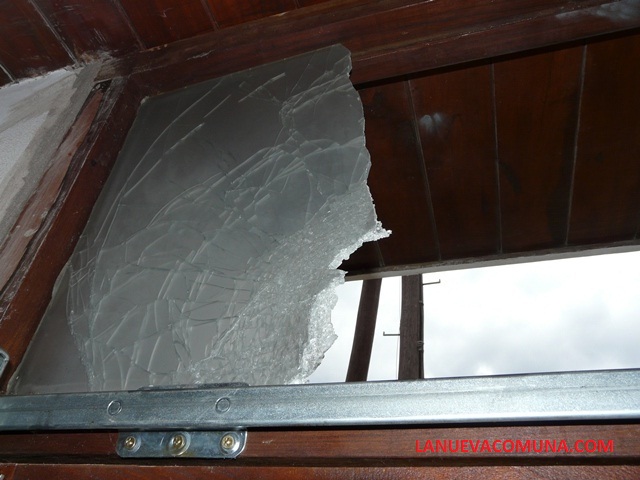 Según pudo apreciar LANUEVACOMUNA.COM, el vidrio de la ventana ubicada en la parte superior del portón del estacionamiento presenta una considerable rotura. El vidrio de la mencionada ventana es de seguridad y es de los denominados «mallados», es decir con una estructura de alambre en su interior, por lo que sólo es posible vulnerarlo con un fuerte impacto o explosión. También es de mencionar algunos daños menores a la mampostería exterior, tal como se aprecian en las imágenes.