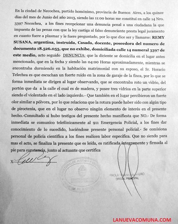En horas de la mañana, la esposa del jefe comunal efectuó la denuncia policial cuya copia se publica en exclusiva en LANUEVACOMUNA.COM