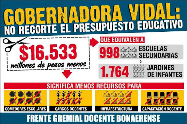 Según detalló Laura Salomón, Secretaria General Adjunta de SUTEBA Necochea, el recorte presupuestario propuesto por la gobernadora María Eugenia Vidal significará una reducción de «16.533 millones de pesos para el año 2017», hecho que traerá aparejado «un deterioro de la calidad educativa no solo en términos de los salarios docentes» sino también en cuestiones vinculadas al Servicio Alimentario Escolar (SAE), al transporte y a las condiciones edilicias y de infraestructura.