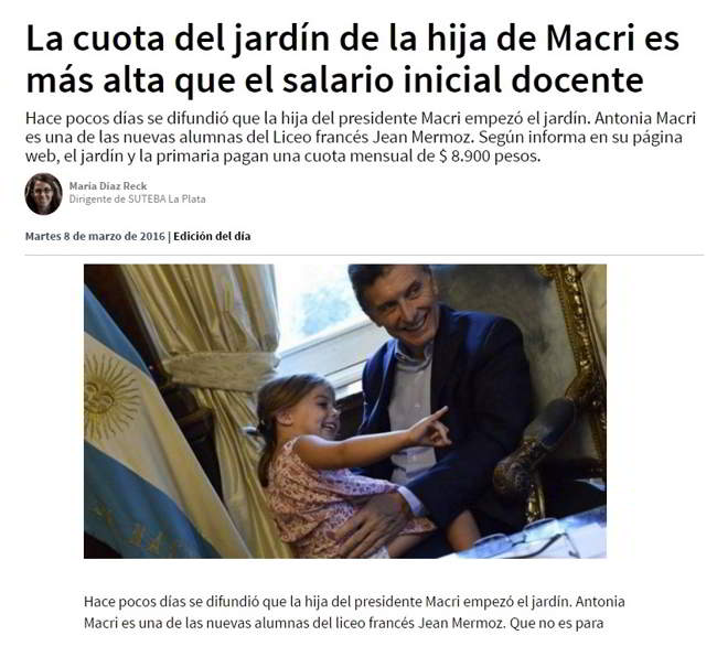 #SemanaCritica Macri le paga la cuota del jardín a Antonia de $ 8900,ese monto supera el salario inicial docente(diferencia de clase)— Guillermo Peralta (@Guille_U2) 11 de marzo de 2017