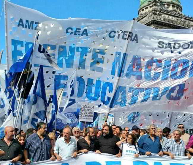 A la cabeza de la multitud con una bandera con la consigna “Apertura de paritarias” protestan la secretaria general de la Confederación de Trabajadores de la Educación (Ctera) Sonia Alesso, sus pares de la Unión Docentes Argentinos (UDA) Sergio Romero, del Sindicato Argentino de Docentes Privados (Sadop) Mario Almirón, la Confederación de Educadores Argentinos (CEA) Fabián Felman y la Asociación del Magisterio de Enseñanza Técnica (Amet) Héctor Pedro Cova.